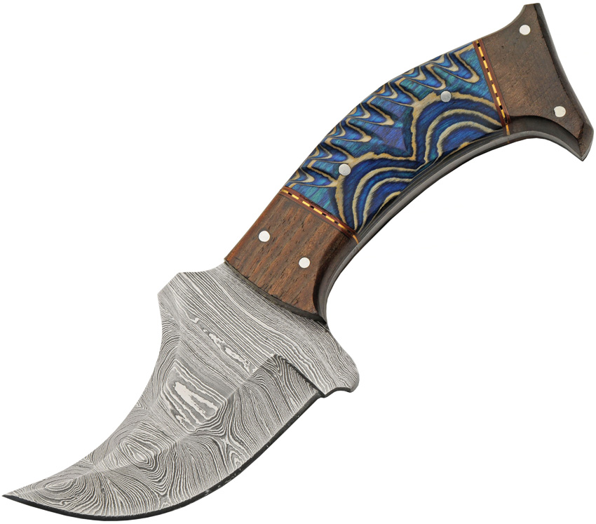 8″ (20.32cm) overall. 3.5″ (8.89cm) Damascus steel curved blade. Blue and brown wood handle. Full tang. Brown leather belt sheath. Boxed.
