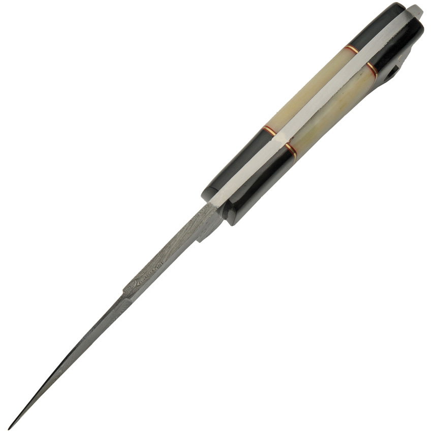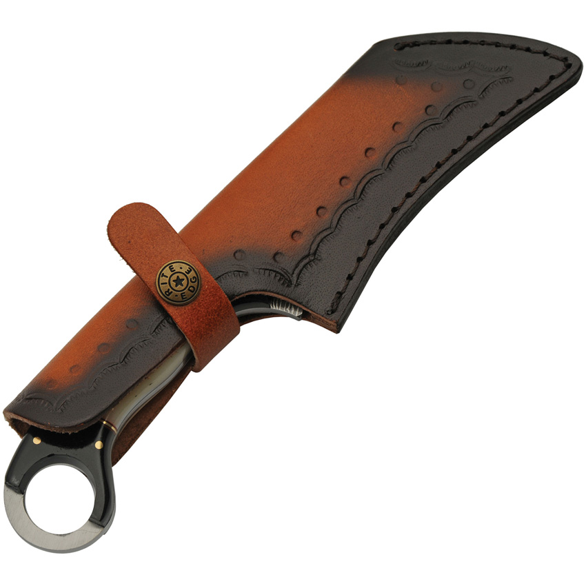 9″ (22.86cm) overall. 4.25″ (10.8cm) Damascus steel karambit blade. Finger ring. Full, extended tang. Buffalo horn and camel bone handle with red and brass spacers. Brown leather belt sheath. Boxed.