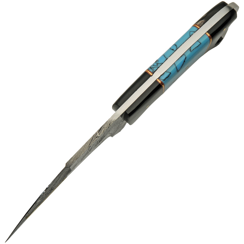 9″ (22.86cm) overall. 4.25″ (10.8cm) Damascus steel karambit blade. Finger ring. Full, extended tang. Buffalo horn and turquoise handle with red and brass spacers. Brown leather belt sheath. Boxed.