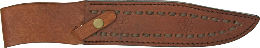 13 3/4″ overall. 8 3/4″ damascus steel bowie blade. Stag handle with brass guard and pommel. Brown leather belt sheath.