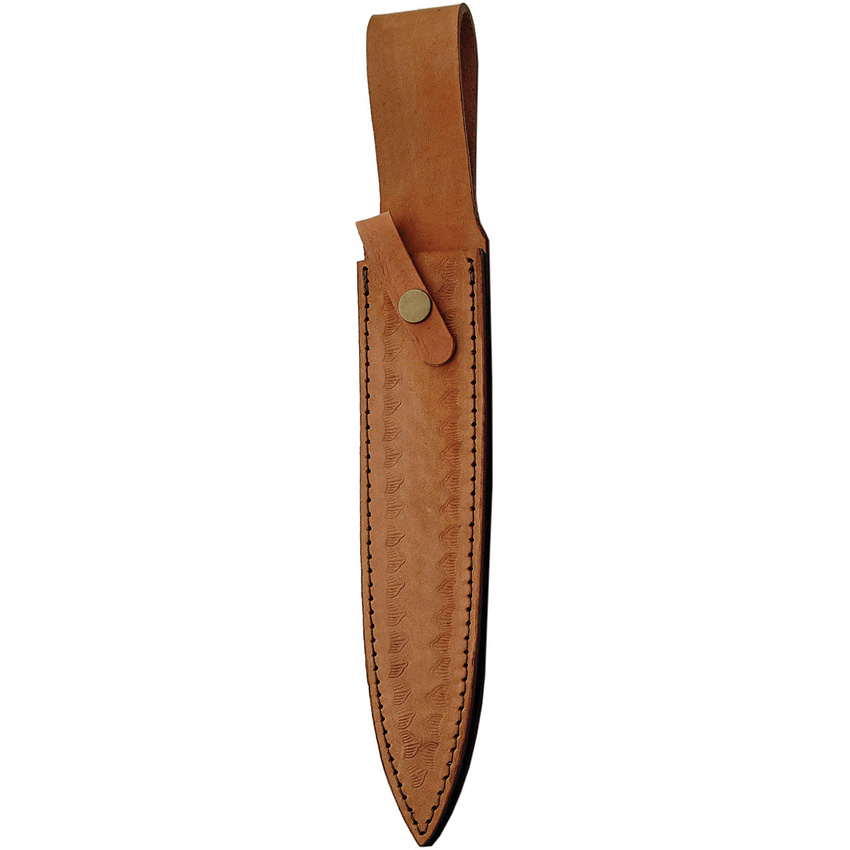 15 1/2″ overall. 9 1/2″ Damascus steel double edge dagger blade. Rosewood handles with antique nickel silver spacer stripes and brass pin trim. Antique nickel silver guard and pommel. Brown leather belt sheath.