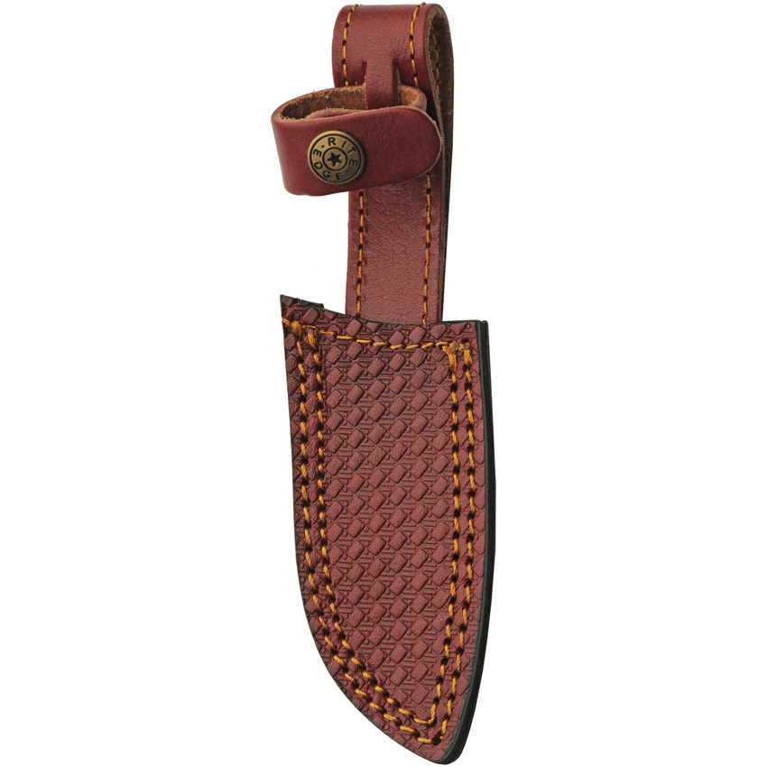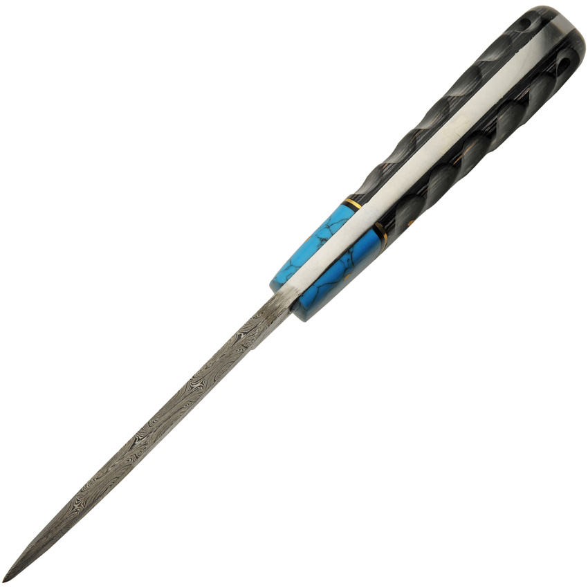 8″ (20.32cm) overall. 4″ (10.16cm) Damascus steel blade. Black sculpted wood handle. Full tang. Lanyard hole. Turquoise stone spacer. Brown leather belt sheath. Boxed.