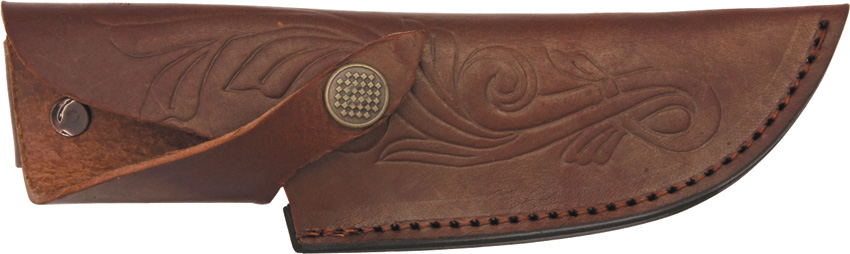 8 3/4″ overall. Damascus steel blade. Full tang. Stag handles with wood and brass spacer. Brass finger guard. Lanyard hole. Leather belt sheath.