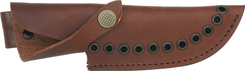 9 1/2″ overall. 4 1/2″ damascus steel guthook blade. Genuine stag handle with brass finger guard and pommel. Leather belt sheath.