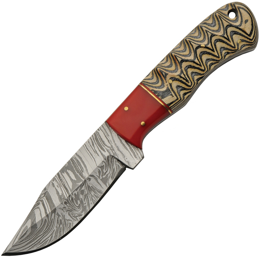 8.5″ (21.59cm) overall. 4″ (10.16cm) Damascus steel clip point blade. Brown sculpted pakkawood handle. Full tang. Lanyard hole. Red resin spacer. Brown leather belt sheath. Boxed.