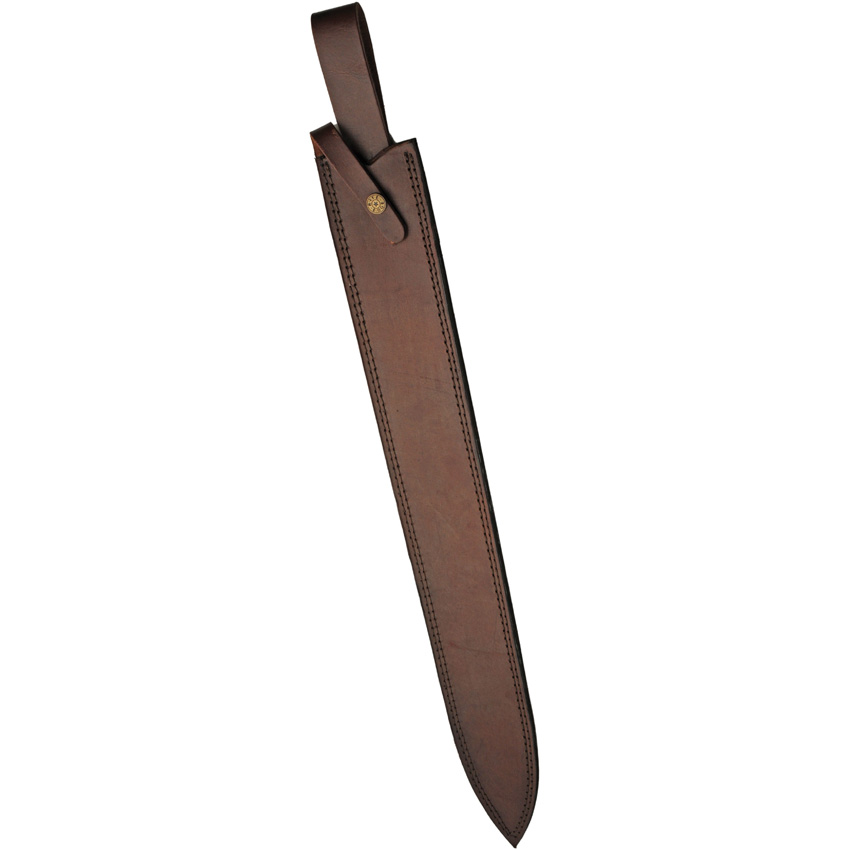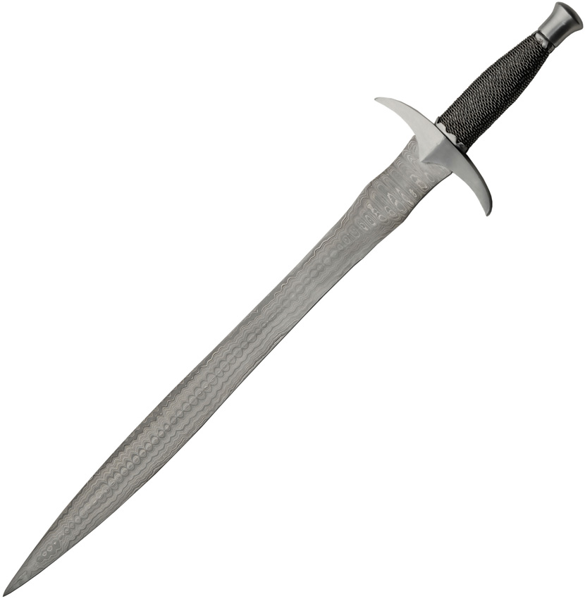 29″ (73.66cm) overall. 23″ (58.42cm) double edge Damascus steel blade. Black wire wrapped handle. Steel guard and pommel. Fuller groove. Brown leather belt sheath. Boxed.