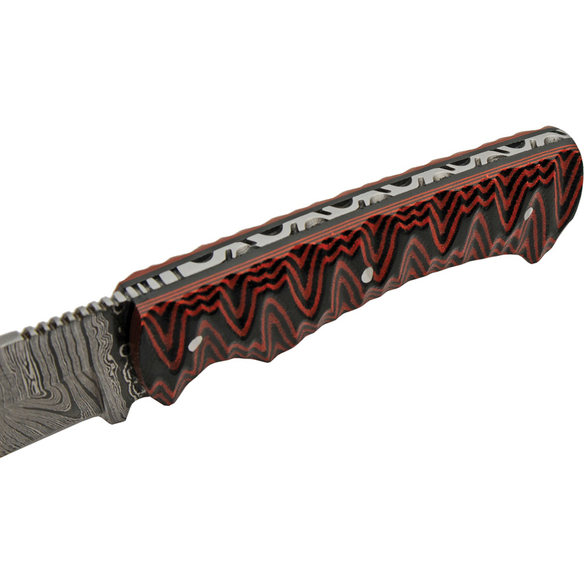 9.5″ (24.13cm) overall. 4.75″ (12.07cm) Damascus steel skinner blade. Black and red sculpted micarta handle. Full tang. Brown leather belt sheath. Boxed.