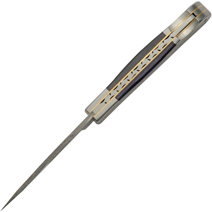 4.25″ (10.8cm) closed. 3.5″ (8.89cm) Damascus steel clip point blade. Blue pakkawood handle. Stainless bolster(s). Brown leather belt sheath. Boxed.