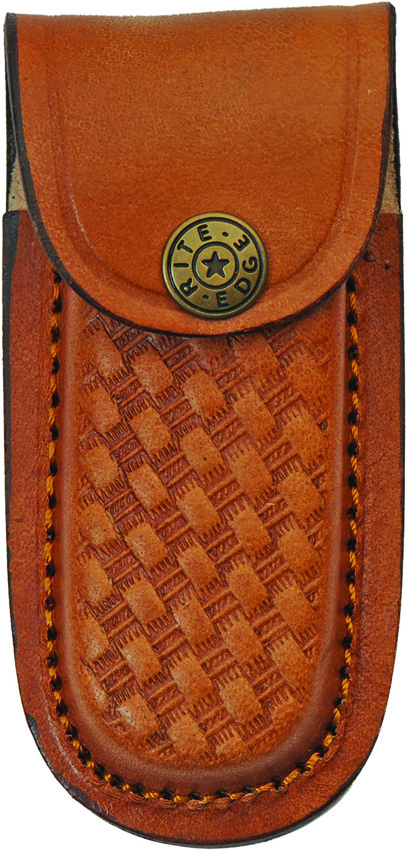 3.75″ (9.53cm) closed. 3″ (7.62cm) Damascus steel clip point blade. Black and red sculpted wood handle. Brass bolster(s). Brown leather belt sheath. Boxed.
