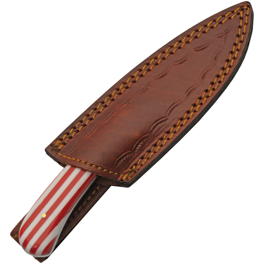 7″ (17.78cm) overall. 3″ (7.62cm) Damascus steel blade. Red, white, and blue acrylic handle. Full tang. Brown leather belt sheath. Boxed.