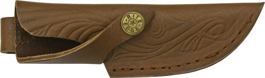 8 1/4″ overall. 3 1/8″ damascus steel blade. Stag tip handle with brass guard. Brown leather belt sheath.