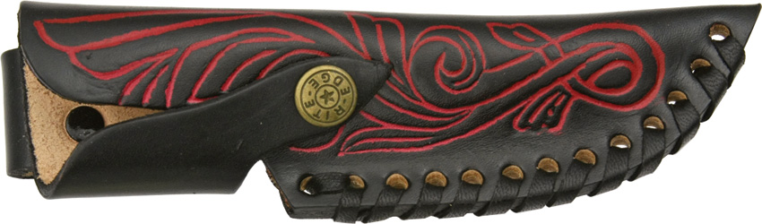 8 1/4″ overall. 3 5/8″ damascus steel skinner blade with filework. Round design stag handle with brass guard and pommel. Black leather belt sheath with embossed red trim.