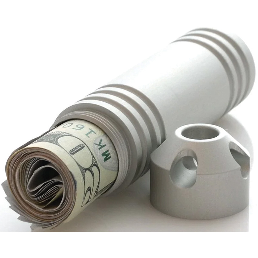 Waterproof to 1000 feet. Food safe. Quad Loop secure cap for tethering options. Internal dimensions: 0.75″ x 2.95″. Aluminum construction. Color: Silver. Hang packaged.