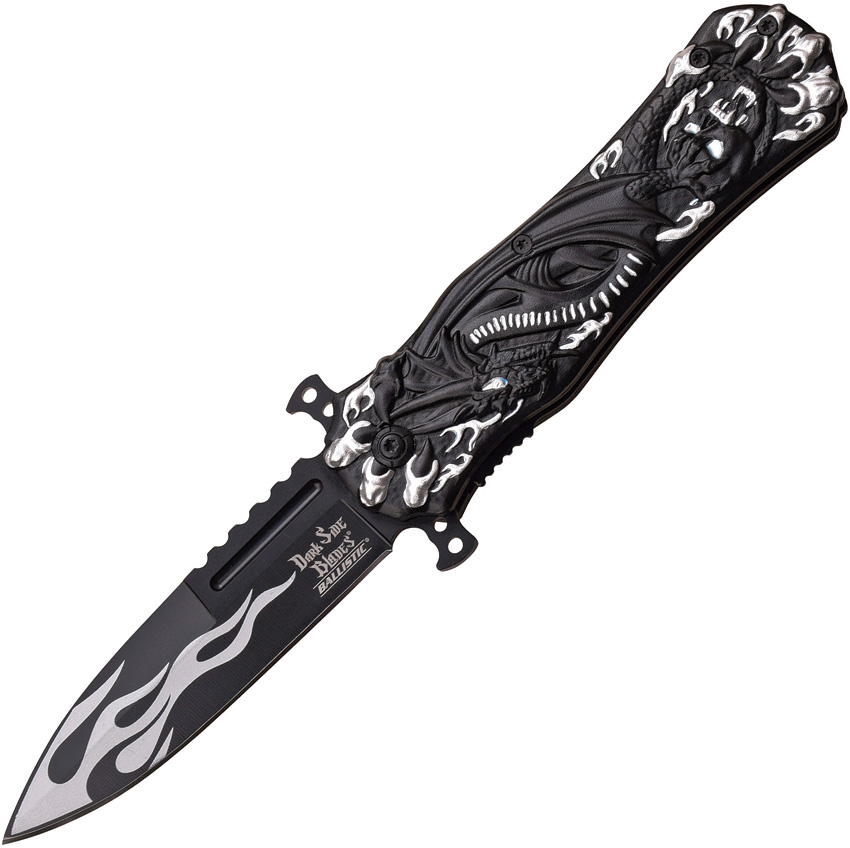 Type: Assisted Opening; Closed: 4.75″; Blade: 3.75″ l Stainless l Standard Edge l Black Finish; Handle: Aluminum; Other Info: Extended Tang l Pocket Clip l Thumb Ridge. Silver flame blade artwork. Silver and black handles with dragon and flame artwork. Boxed.