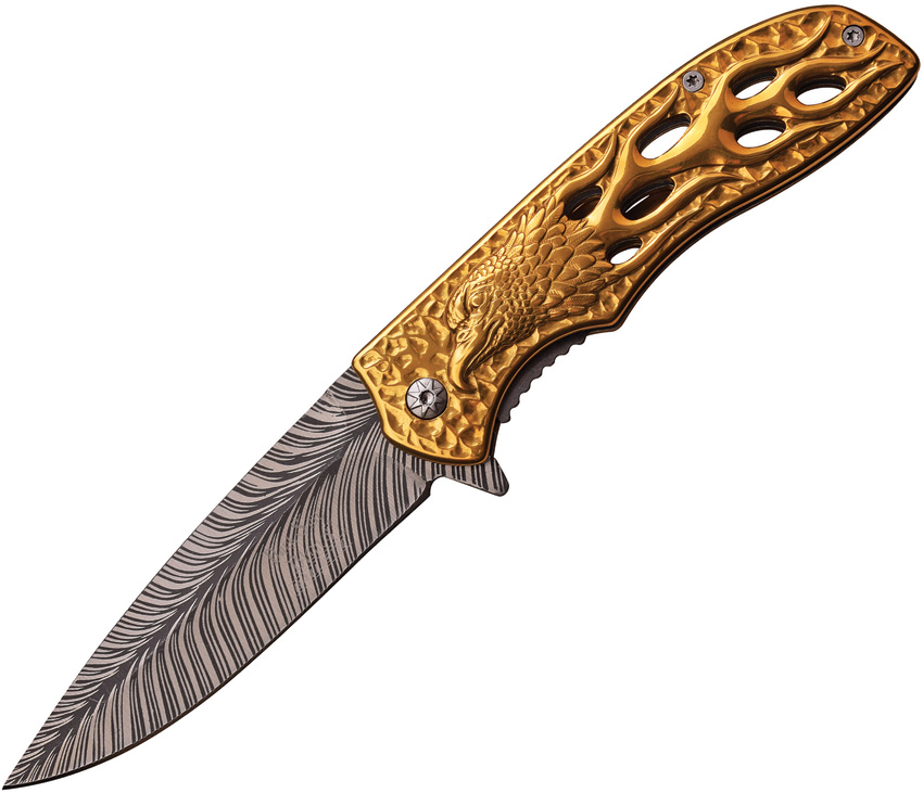 Type: Assisted Opening; Closed: 4.5″; Blade: 3.75″ l Stainless l Standard Edge; Handle: Gold l Stainless; Other Info: Extended Tang l Pocket Clip. Acid etched blade. Gold titanium coated handles with eagle artwork. Boxed.