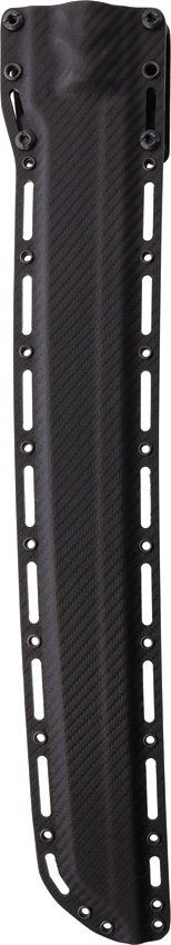 26″ (66.04cm) overall. 16″ (40.64cm) satin finish CPM MagnaCut stainless blade. Black and gray sculpted G10 handle. Full tang. Samurai style blade. Carbon fiber Kydex MOLLE compatible belt sheath. Bulk packed.
