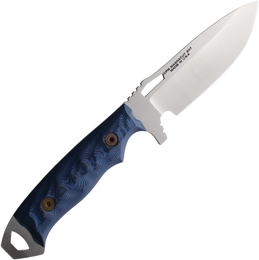 8.75″ (22.23cm) overall. 3.75″ (9.53cm) satin finish CPM MagnaCut stainless blade. Black and blue sculpted G10 handle. Full, extended tang. Lanyard hole. Black Kydex belt sheath. Boxed.