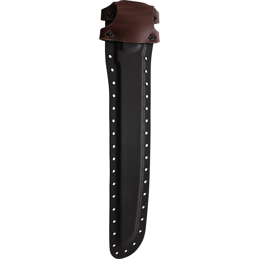 22″ (55.88cm) overall. 14″ (35.56cm) Specter finish CPM-3V carbon steel blade. Ironwood handle. Full tang. Black synthetic silk wrapped handle. Black Kydex and brown leather scabbard. Bulk packed.