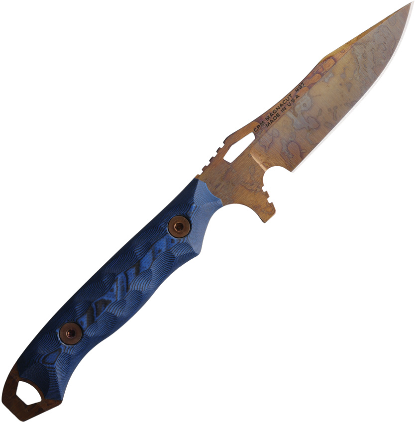 8.25″ (20.96cm) overall. 3.38″ (8.59cm) Arizona copper finish CPM MagnaCut stainless blade. Black and blue sculpted G10 handle. Full, extended tang. Lanyard hole. Black Kydex belt sheath. Boxed.