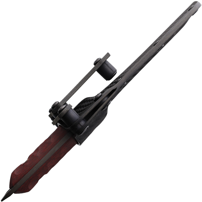 8.25″ (20.96cm) overall. 3.38″ (8.59cm) black Apocalyptic finish CPM MagnaCut stainless blade. Black and red sculpted G10 handle. Full, extended tang. Lanyard hole. Black Kydex belt sheath. Boxed.