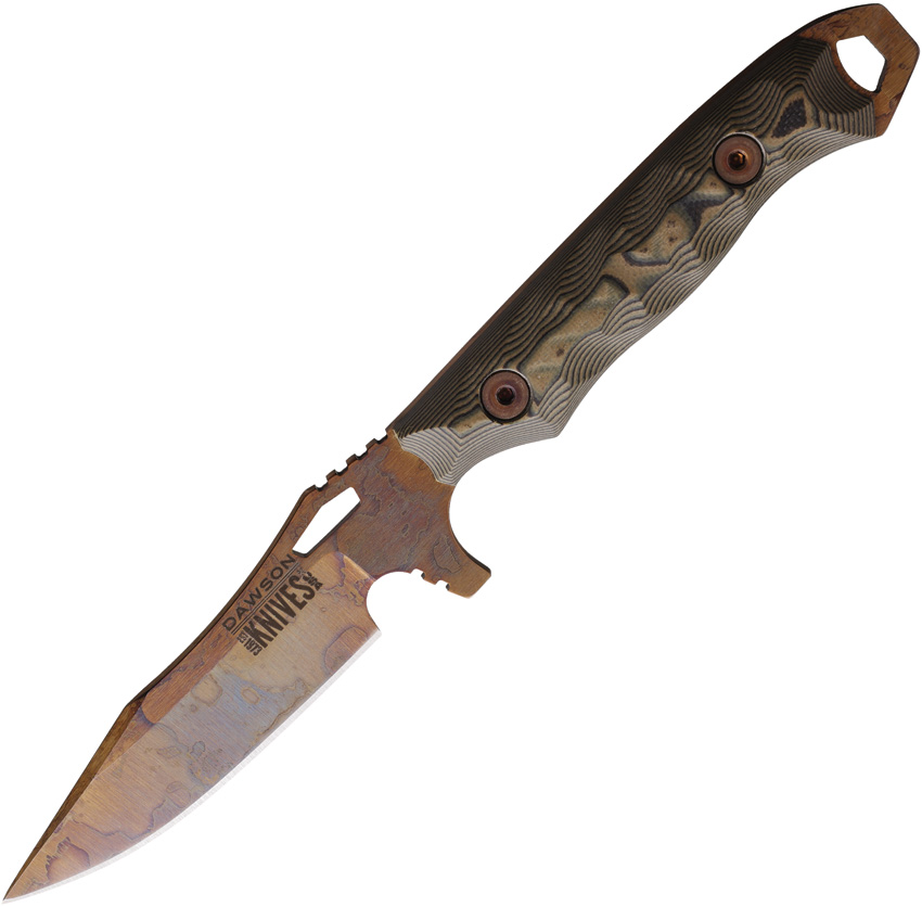 8.25″ (20.96cm) overall. 3.38″ (8.59cm) Arizona copper finish CPM MagnaCut stainless blade. Ultrex camo G10 handle. Full, extended tang. Lanyard hole. Black Kydex belt sheath. Boxed.