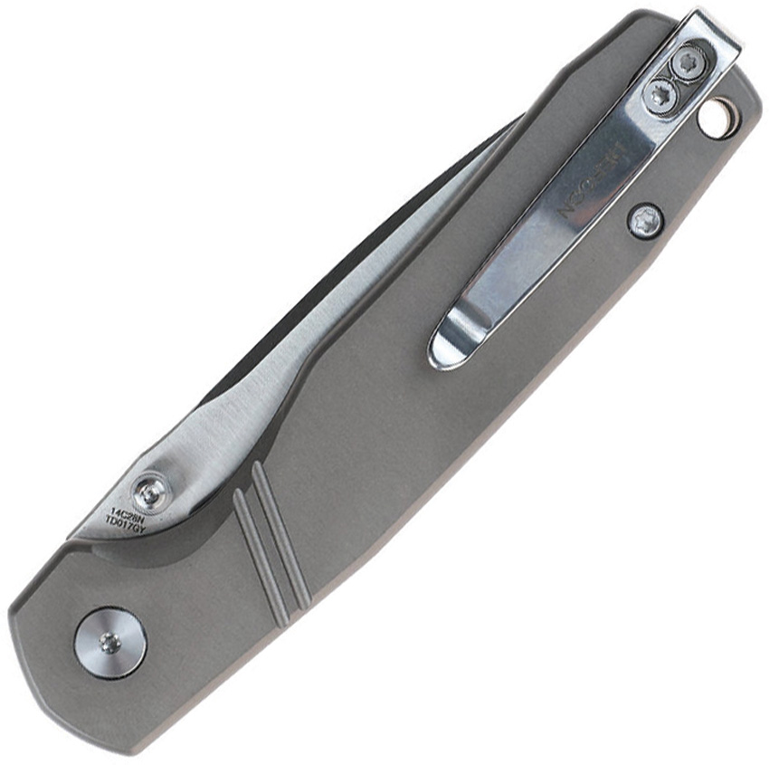 4″ (10.16cm) closed. 3″ (7.62cm) satin finish 14C28N Sandvik stainless recurve blade. Gray aluminum handle. Thumb stud. Lanyard hole. Pocket clip. Boxed.