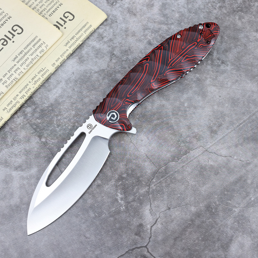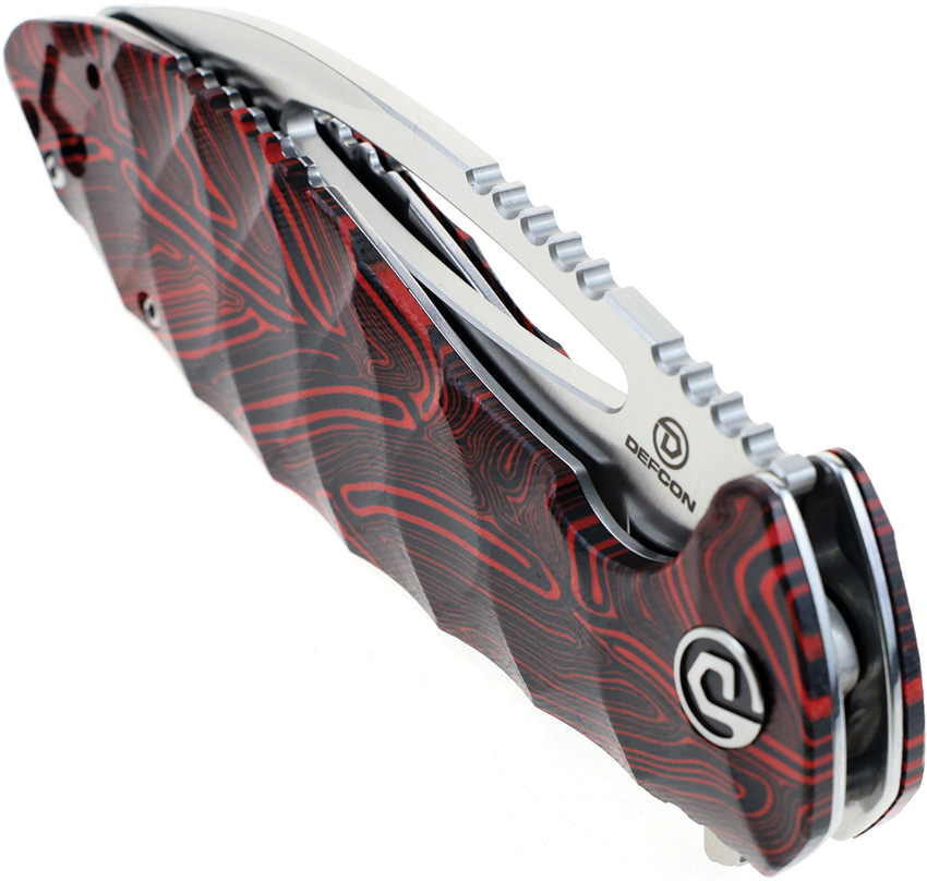 5″ (12.7cm) closed. 4″ (10.16cm) satin finish 14C28N Sandvik stainless blade. Black and red sculpted G10 handle. Extended tang. Lanyard hole. Pocket clip. Thumb pull. Boxed.