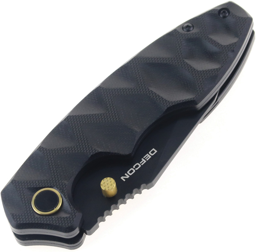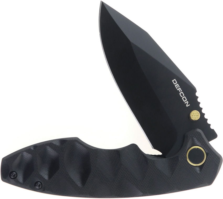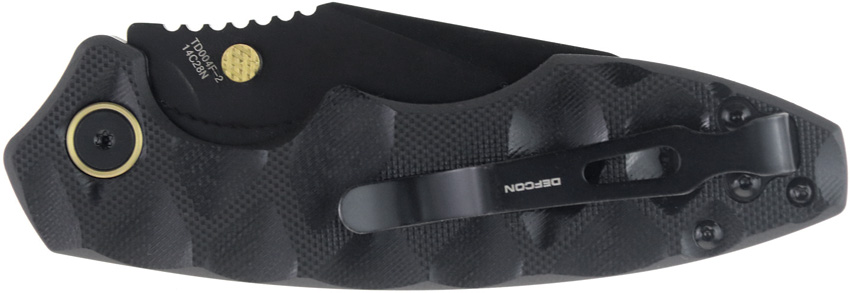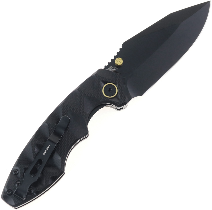 4.38″ (11.13cm) closed. 3.25″ (8.26cm) black coated 14C28N Sandvik stainless blade. Black sculpted G10 handle. Pocket clip. Thumb stud. Gold accents. Boxed.