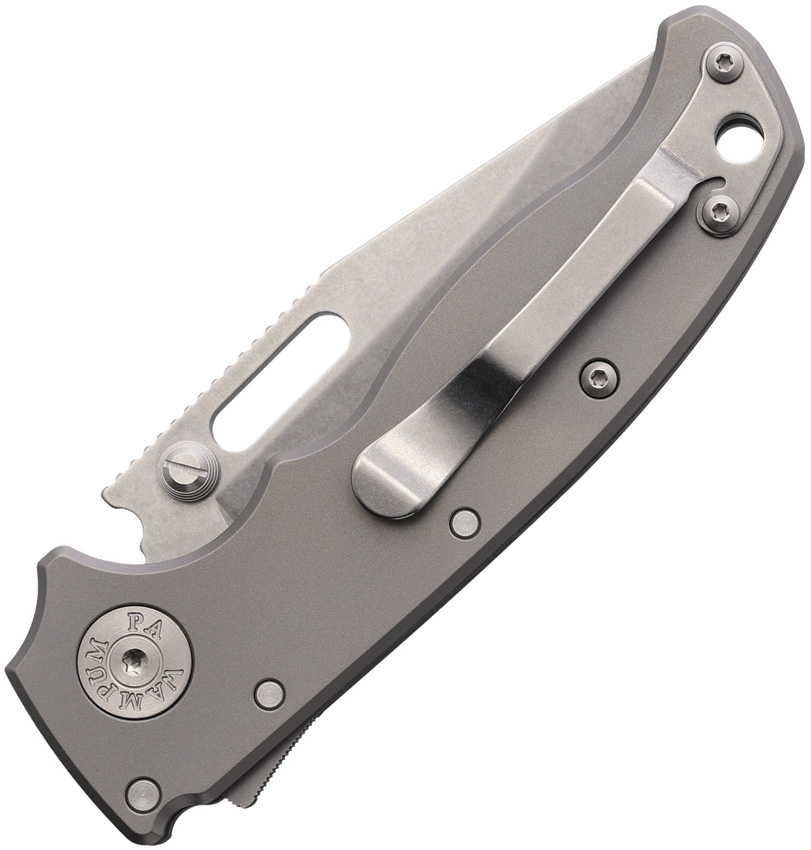 4.75″ (12.07cm) closed. 2.88″ (7.32cm) stonewash finish 3V stainless clip point blade. Gray smooth titanium handle. Thumb pull. Extended tang. Pocket clip. Comes in plastic case.