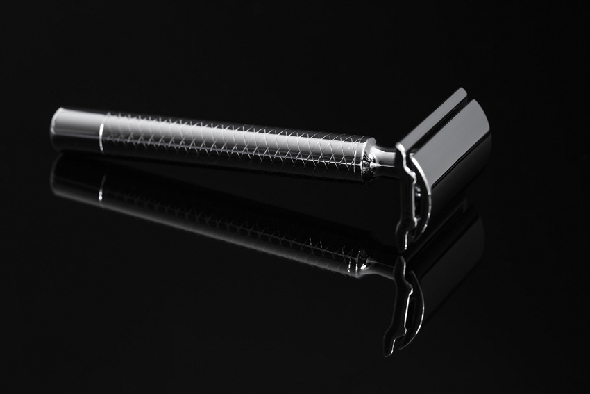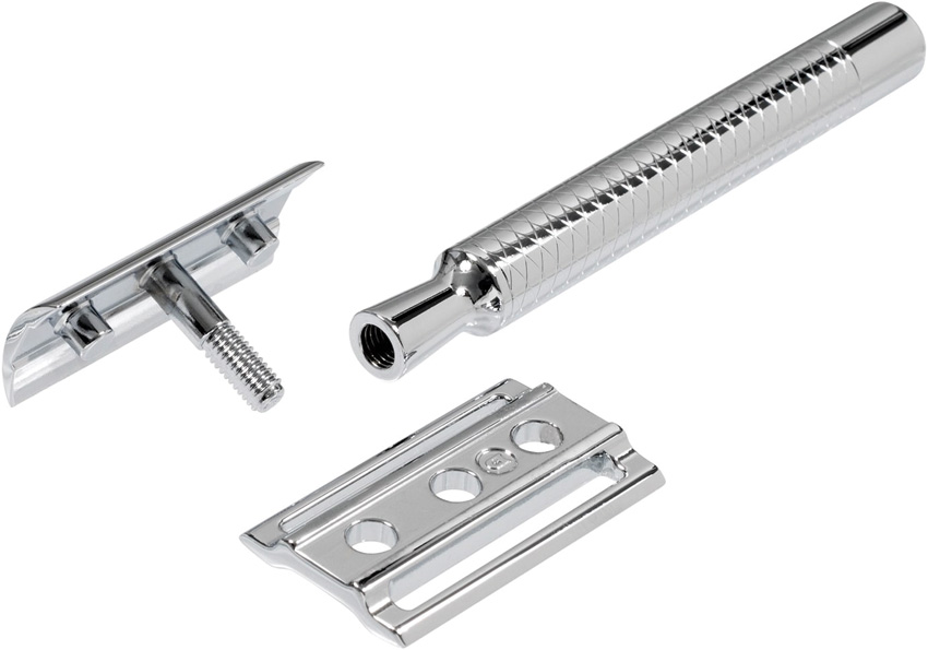 4.2″ overall. Brass handle piece with zinc diecast shaving head and bright chrome electroplated surfaces. Closed comb. Straight cut. Stabilized screw, three-part razor. Includes 10 Super Platinum razor blades. Boxed.