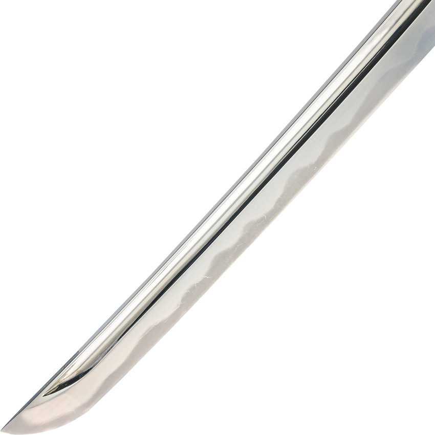 27.75″ (70.49cm) overall. 19.5″ (49.53cm) blade. Black G10 handle. Weight: 1.2lb. 1566 steel blade. Features a real hamon line with a copper habaki and seppa. The tsuka encapsulates the tang in textured G10 and is dual pinned for a secure grip which is unremovable. Silver dragon menuki. Textured black saya features an olive paracord sageo around a polymer kurikata and kojiri. Boxed.