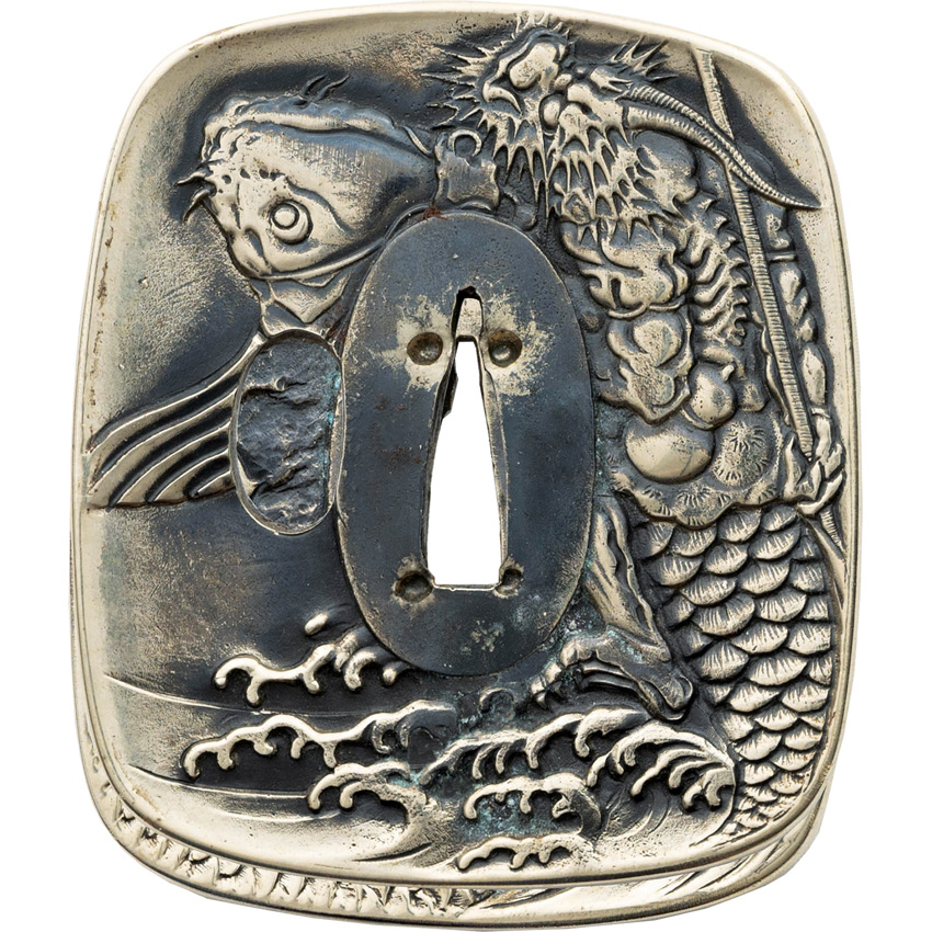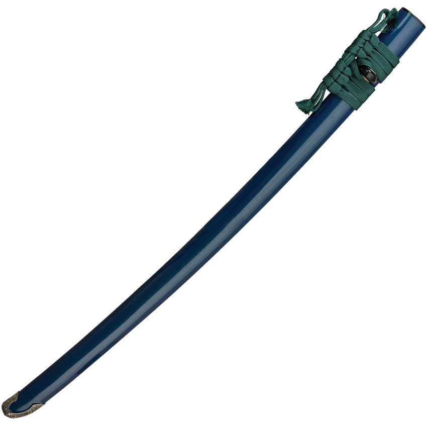 Taikyu Katana embodies all the elements of endurance in master piece katana. The 27 ½” folded steel blade is a mixture of T10 and 9260 steels to give the hada clear appearance. The blade is light and quick in the hand. The 10 ½” tsuka is wrapped in blue Japanese silk over real same. The deep teal lacquered saya matches perfectly when light passes over it revealing a teal sparked reflection that is almost impossible to photograph. The furniture from the kashira to the kojiri features a turbulent wave them. The Taikyu Katana will please the most discerning collector of high end folded steel katana or those who just love sword art.