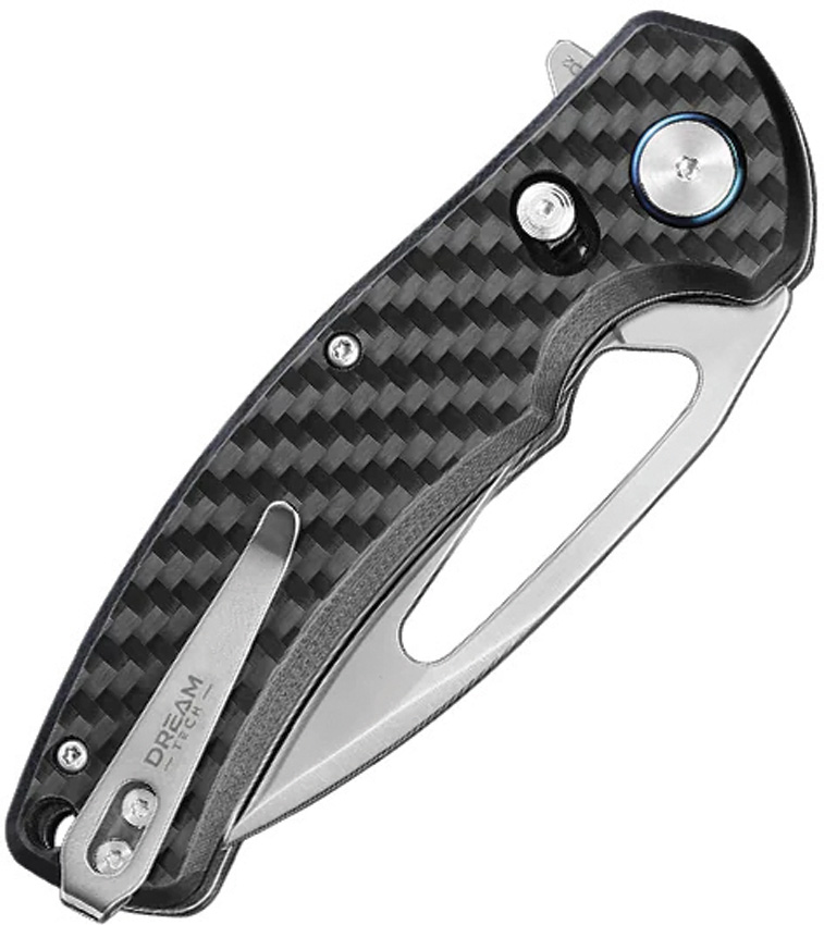 4.5″ (11.43cm) closed. 3.13″ (7.95cm) satin finish D2 tool steel drop point blade. Carbon fiber handle. Extended tang. Lanyard hole. Thumb pull. Pocket clip. Boxed.