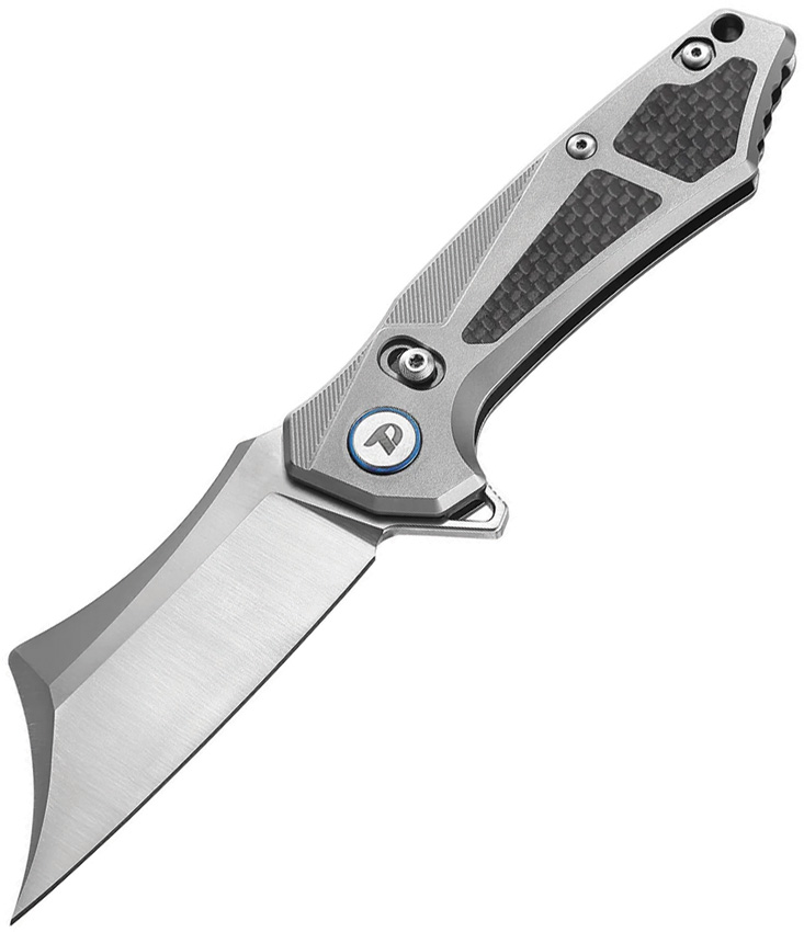 4.5″ (11.43cm) closed. 3.25″ (8.26cm) satin finish Bohler M390 stainless modified clip point blade. Gray titanium handle with Twill carbon fiber inlay. Bottle opener. Lanyard hole. Pocket clip. Black synthetic zippered storage case. Boxed.