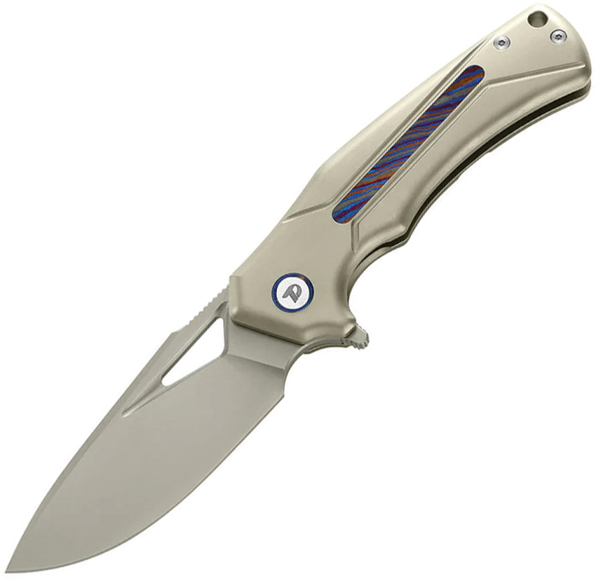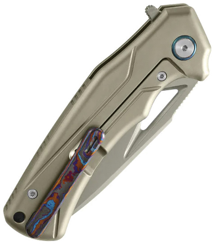 4.5″ (11.43cm) closed. 3.25″ (8.26cm) bead blast finish Bohler M390 stainless drop point blade. Gold anodized titanium handle with zirconium inlay. Extended tang. Thumb pull. Lanyard hole. Pocket clip. Black synthetic zippered storage case. Boxed.