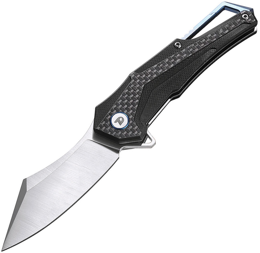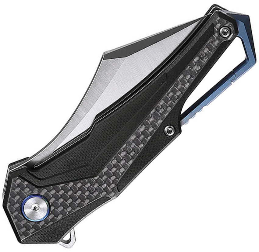 4.25″ (10.8cm) closed. 3″ (7.62cm) satin finish D2 tool steel reverse tanto blade. Black G10 handle with carbon fiber onlay. Extended tang. Lanyard hole. Pocket clip. Boxed.