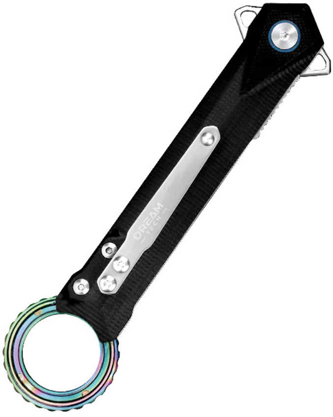 5.75″ (14.61cm) closed. 3.38″ (8.59cm) satin finish D2 tool steel tanto blade. Black G10 handle. Extended tang. Finger ring. Pocket clip. Spectrum anodized accents. Boxed.