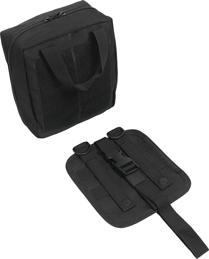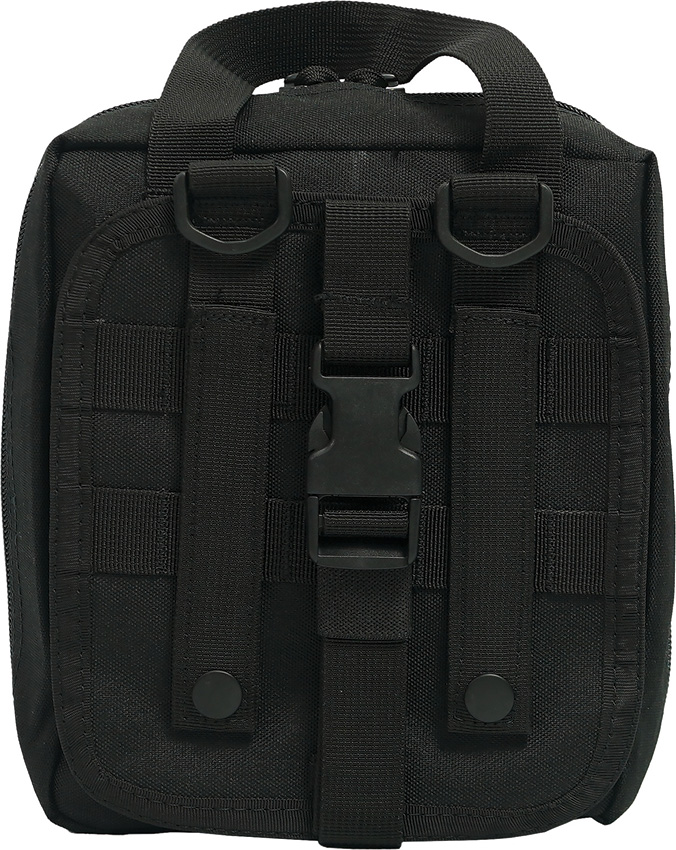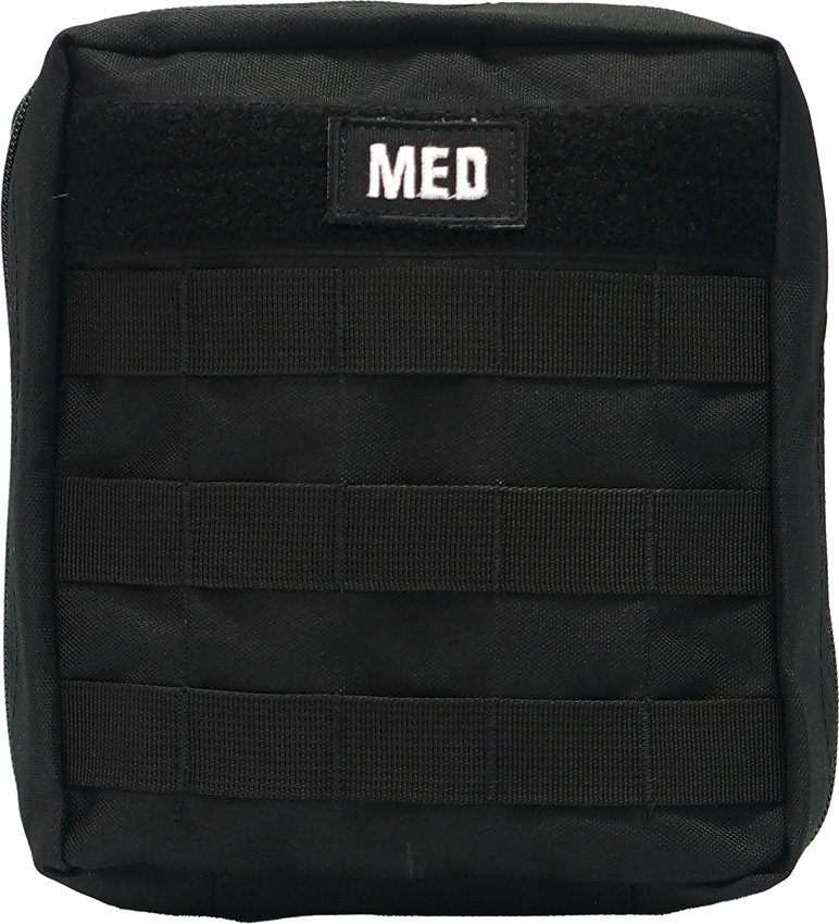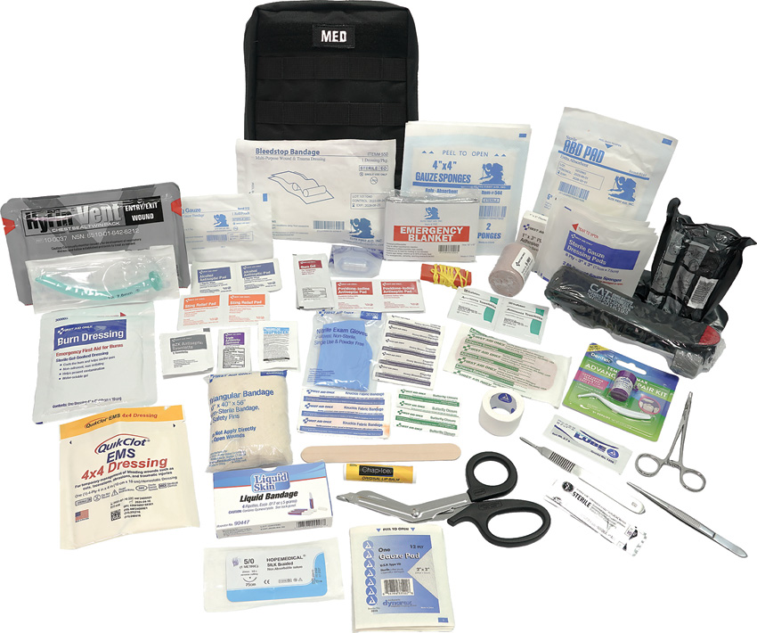 Includes: QuikCLot hemostatic gauze pad, 4″x4″; Israeli bandage, 4″; Burn gel dressing, 4″x4″; Nasopharyngeal airway; Stainless curved hemostat; Scalpel handle #3; Stainless scissors; (4) Sterile gauze, 2″x2″; Abdominal pad, 5″x9″; (2) Knuckle bandages; (5) Butterfly closure strips; CPR face shield; Elastic bandage, 2″; (4) BZK wipes; (4) Alcohol wipes; (2) Ammonia inhalants; Emergency blanket; LED pen light; (2) Pair black Nitrile gloves; (2) Burn gel; Liquid skin; CAT tourniquet; Conforming gauze, 4″x4.1 yds; HyFin vented chest seal, 2pk; Lubricant; suture; (2) Scalpel blade; Dental repair kit; (4) Sterile gauze, 3″x3″; (8) Sterile gauze, 4″x4″; (2) Fingertip bandages; (16) Bandage strips, 1″x3″; Triangle bandage; Lip balm; (4) Sting and bite wipes; (2) Pain relievers; (2) Triple antibiotics; Plastic whistle; EMT shears, 7.25″; Stainless tweezers; (4) Iodine wipes; Tongue depressor; (4) Bandage strips, 2″x4″. Comes in black nylon zippered bag with removable velcro-panel on the back with MOLLE straps. Bulk packed.