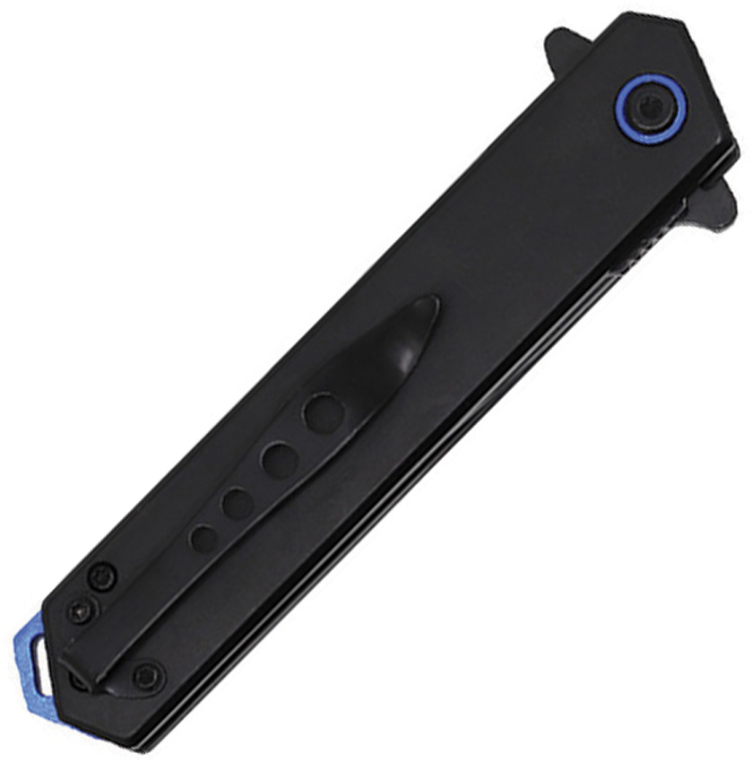 Assisted opening. 4.75″ (12.07cm) closed. 3.75″ (9.53cm) black finish stainless tanto blade. Black stainless handle with black G10 inlay. Extended tang. Lanyard hole. Pocket clip. Blue aluminum backspacer. Boxed.