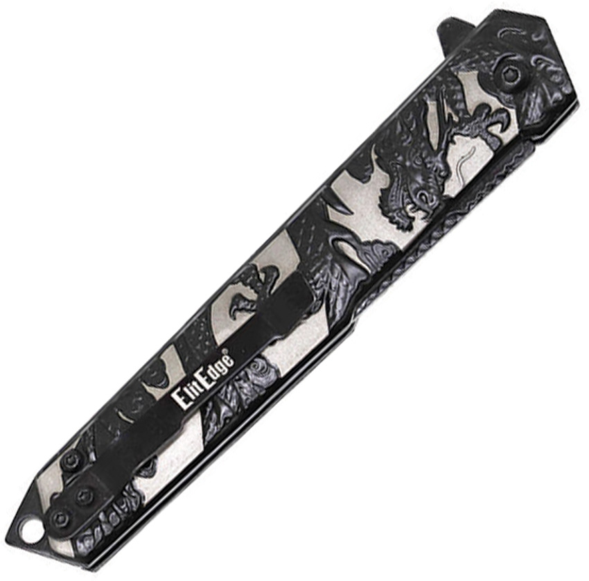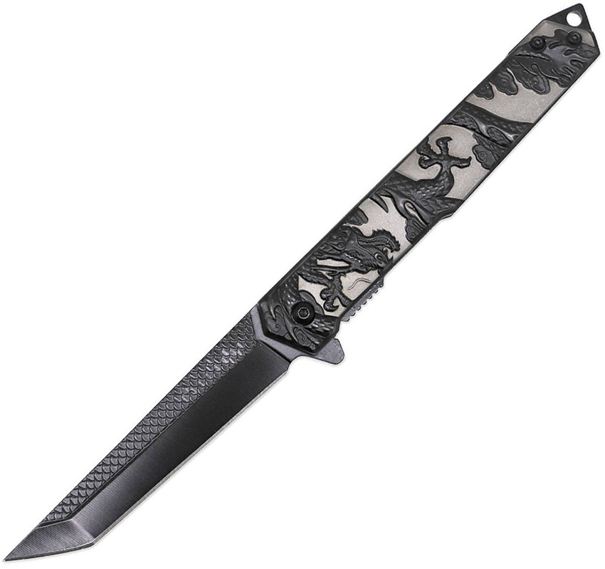 Assisted opening. 4.75″ (12.07cm) closed. 3.5″ (8.89cm) black finish stainless tanto blade. Black and silver sculpted stainless handle. Extended tang. Lanyard hole. Pocket clip. Dragon handle artwork. Boxed.