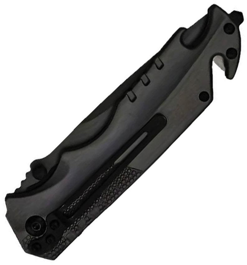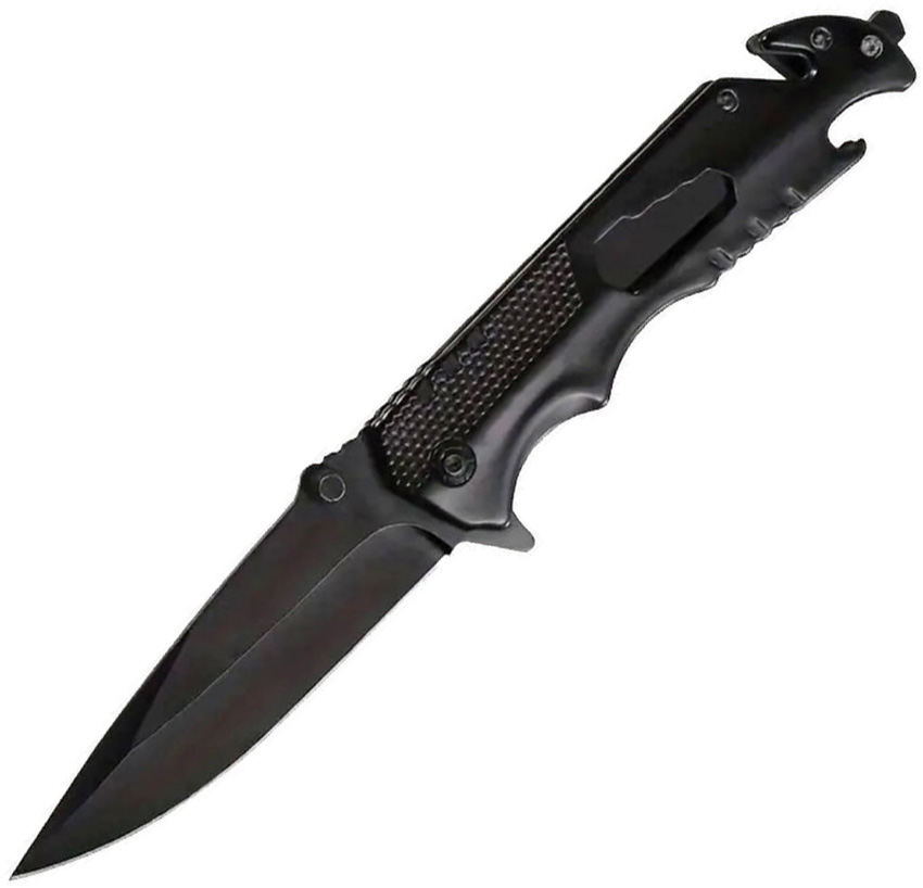 Assisted opening. 5″ (12.7cm) closed. 4″ (10.16cm) black finish stainless spear point blade. Black stainless handle. Extended tang. Pocket clip. Belt/cord cutter. Thumb stud. Glass breaker. Positioning wrench. Boxed.