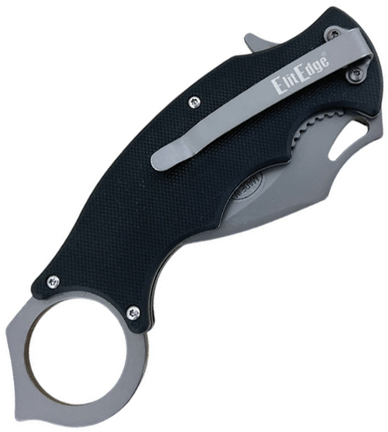 5.5″ (13.97cm) closed. 2.5″ (6.35cm) gray coated 8Cr13MoV stainless karambit blade. Black finger grooved G10 handle. Extended tang. Thumb pull. Finger ring. Pocket clip. Boxed.