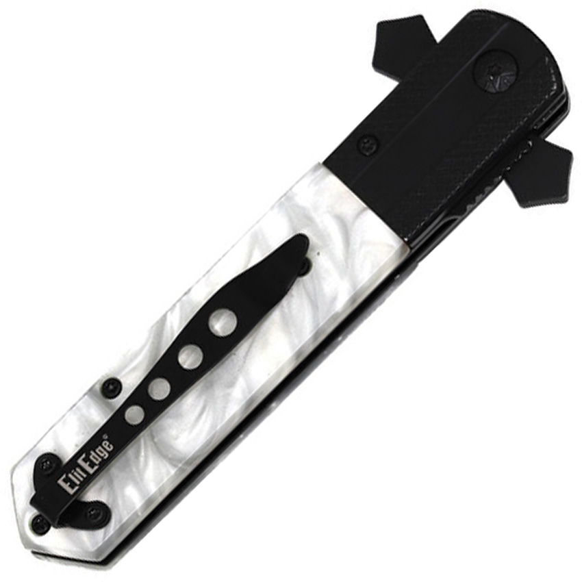 Assisted opening. 5″ (12.7cm) closed. 4″ (10.16cm) black finish false edge stainless blade. White synthetic handle. Extended tang. Pocket clip. Inlay shield. Boxed.