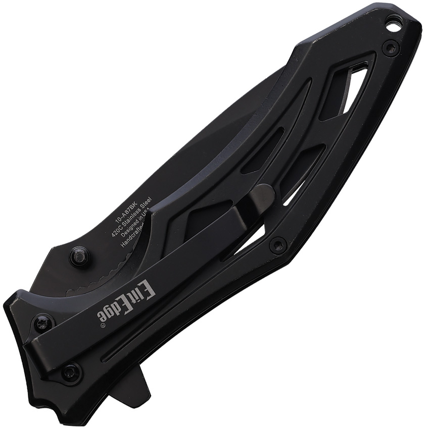 Assisted opening. 4.75″ (12.07cm) closed. 3.25″ (8.26cm) black stonewash finish 420 stainless blade. Black stainless handle. Extended tang. Thumb stud. Lanyard hole. Pocket clip. Boxed.