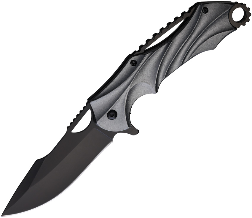 Assisted opening. 5″ (12.7cm) closed. 3.5″ (8.89cm) black finish 420 stainless blade. Gray sculpted aluminum handle. Extended tang. Thumb pull. Lanyard hole. Pocket clip. Boxed.