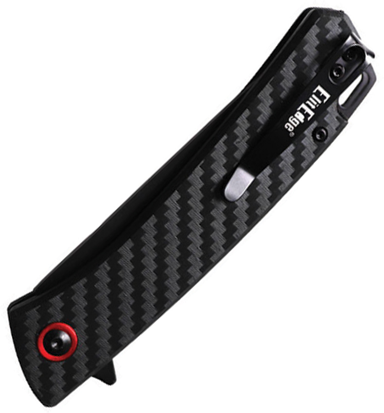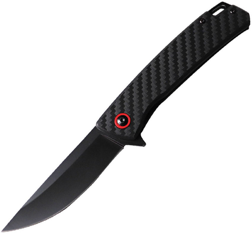 4.75″ (12.07cm) closed. 3.75″ (9.53cm) black finish 8Cr13MoV stainless blade. Carbon fiber handle. Extended tang. Lanyard hole. Pocket clip. Red accents. Boxed.