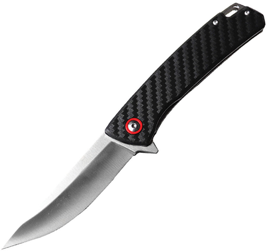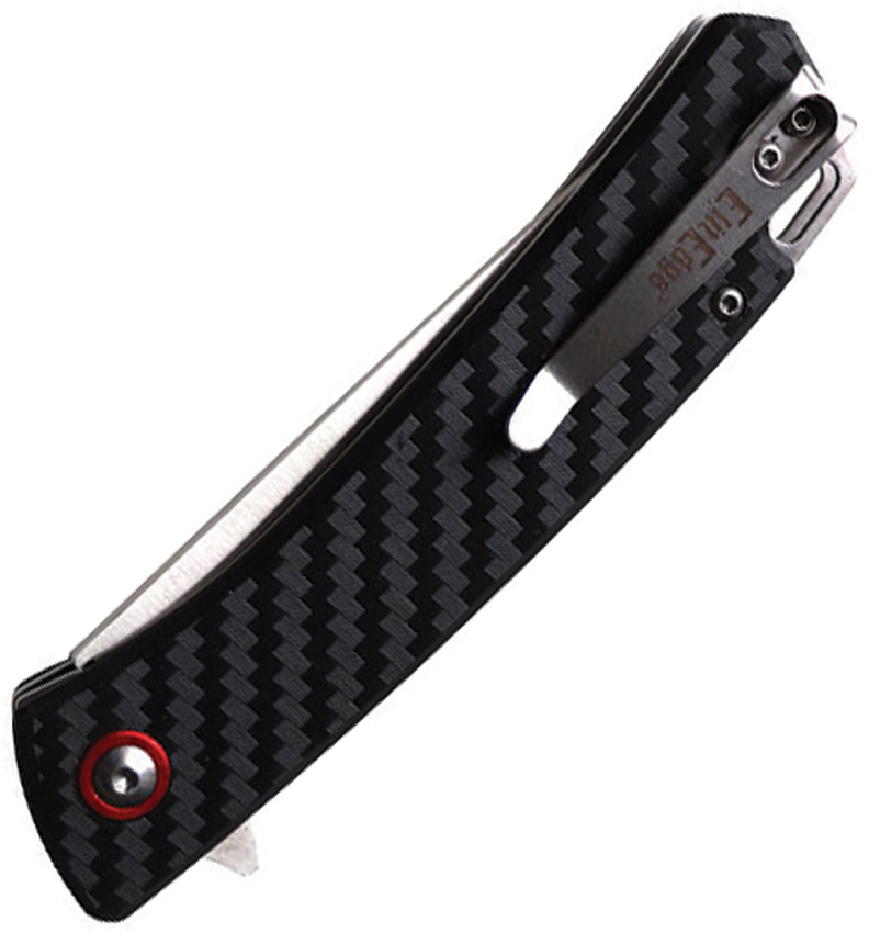 4.75″ (12.07cm) closed. 3.75″ (9.53cm) satin finish 8Cr13MoV stainless blade. Carbon fiber handle. Extended tang. Lanyard hole. Pocket clip. Red accents. Boxed.