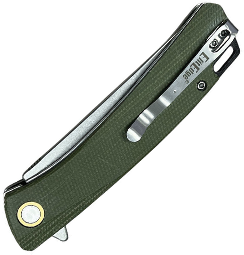 4.5″ (11.43cm) closed. 3.5″ (8.89cm) stonewash finish D2 tool steel blade. Green micarta handle. Extended tang. Lanyard hole. Pocket clip. Boxed.