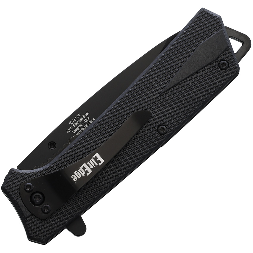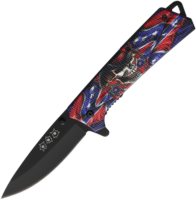 Assisted opening. 5″ (12.7cm) closed. 3.75″ (9.53cm) black coated 420 stainless blade. Checkered ABS handle. Thumb stud. Lanyard hole. Pocket clip. Extended tang. Skull and Confederate flag handle artwork. Boxed.