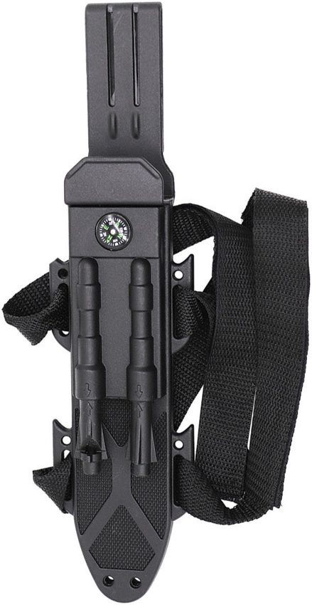 12.5″ (31.75cm) overall. Black finish sawback stainless clip point blade. OD green textured rubber handle. Compass and fire starter on sheath. Leg strap. Black molded plastic belt sheath. Boxed.